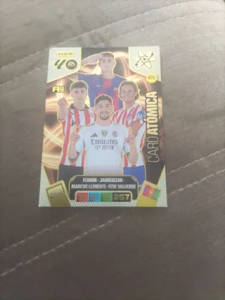Carta de fútbol Panini de la colección Card Atómica. - Número de carta: 476. - Jugadores: Fermín Jauregizar, Marcos Llorente, Fede Valverde. - Incluye estadísticas: 75, 101, 30, 257.