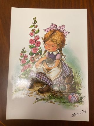 Conjunto de 7 postales infantiles antiguas con ilustraciones de Mary May. Grandes tamaño folio - Diseño de niña con gatitos. - Motivos florales. - Firma de la artista 'Mary May'.