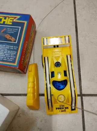 Coche de radiocontrol Porsche 917 de los años 70. Mónocanal solo giraba a izquierda, muy buen estado,caja también,alguna esquina gastada , no probado por no tener pilas de petaca ,usa dos y 4 de 1,5 Fabricado en Hong Kong , medidas 21 x 9 cm - Coche de radiocontrol. - Modelo Porsche 917. - Parece modelo 917/10 - Incluye mando a distancia.