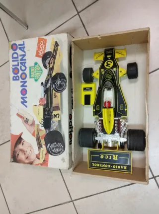 Coche de radiocontrol Rico Bólido Monocanal.Buen estado,caja tocada , funcionando pero le cuesta cambiar hacia adelante, hay q revisar las funciones del mando - Diseño de coche de carreras. - Color negro y amarillo. - Número 3 en el alerón. - Ruedas con llantas negras.