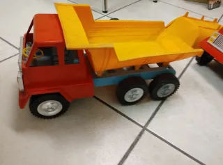 Camión volquete de juguete tipo Karpan, shambers...no lleva logo más un montón de piezas resto de otro para restaurar, dimensiones 41x18x20 cm, interesantes las piezas de las ruedas y el frontal,el plástico está muy justo indica su edad... - Cabina roja con volante amarillo. - Volquete amarillo. - Parrilla frontal plateada.