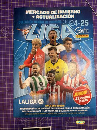 Álbum de cromos de la Liga Este 2024-25 con la colección completa pegada. Contiene todo lo editado y mercado de invierno Extra gold faltan los 2 del barcelona, se puede vender sin extragold