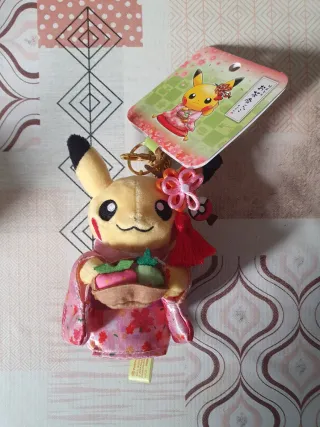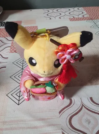 Adorable peluche de Pikachu vestido con un kimono tradicional japonés. Incluye su etiqueta original. - Diseño de Pikachu con kimono rosa floral. - Sostiene una cesta con dulces. - Adorno de flor y borla roja. - Ideal para coleccionistas o fans de Pokémon.