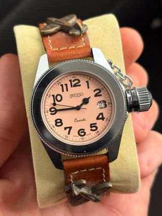 ⌚️Greggio Quartz Swiss Made. ✅ Movimiento de cuarzo suizo. ✅ Caja metálica robusta con corona sobredimensionada y correa de piel marrón con detalles metálicos decorativos de estilo aviador/militar. ✅ Estado: muy bueno,funciona correctamente.