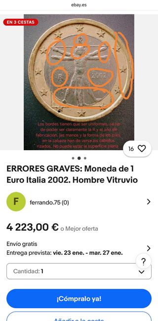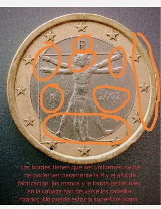 Moneda de 1 Euro de Italia del año 2002, con el diseño del Hombre de Vitruvio. Presenta detalles que podrían considerarse errores de fabricación. - Diseño: Hombre de Vitruvio. - Año: 2002. - Origen: Italia.