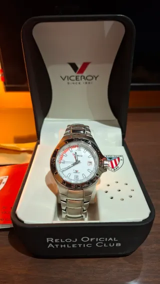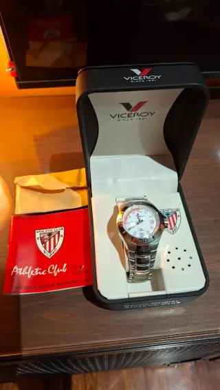 Reloj Viceroy oficial del Athletic Club. - Diseño deportivo y elegante. - Caja y correa de acero inoxidable. - Esfera blanca con detalles en rojo. - Bisel con marcadores. - Cierre desplegable. Apenas usado, en un par de ocasiones a lo sumo, ya que tengo varios. La caja sonaba el himno del athletic al abrirla, ya no lo hace, desconozco si hay alguna forma de cambiar la pila a la caja para que vuelva a sonar. Actualmente el reloj se encuentra sin pila pero la pondria nueva el mismo dia de la venta para comprobar su correcto funcionamiento. No me interesan cambios ni regateos absuerdos. Casio, Panerai, Cadisen, Tissot, Omega, Lotus