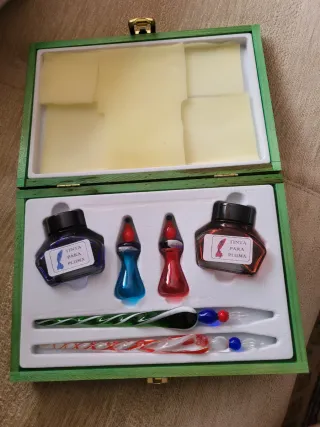 Estuche de plumas de cristal de la marca Samer, ideal para caligrafía. - Incluye dos plumas de cristal decoradas. - Dos frascos de tinta de colores (azul y rojo). - Dos botes de cristal para tinta.