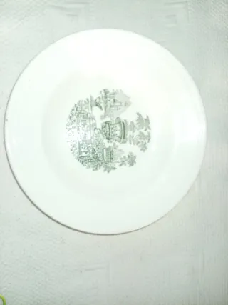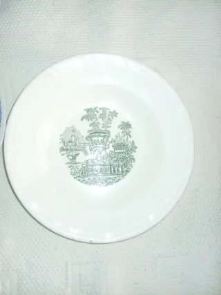 Precioso plato antiguo con un diseño detallado en verde. - Diseño de paisaje con árboles y arquitectura. - Borde liso y blanco.
