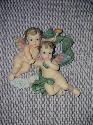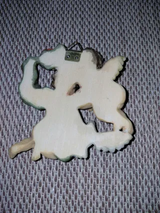 Se vende preciosa figura decorativa de pared que representa a dos ángeles o querubines acompañados de una paloma blanca. Tiene un acabado detallado con colores suaves y elegantes. Estado: Nuevo, sin marcas de uso. Material: Resina de alta calidad con acabado mate. Instalación: Incluye un enganche metálico en la parte trasera para colgar fácilmente en la pared. Medidas aproximadas: 14 cm de alto x 13 cm de ancho. Estilo: Clásico, romántico, vintage. Perfecto para dormitorios infantiles, salones o como detalle para bautizos y comuniones. Hago envíos rápidos y bien protegidos.