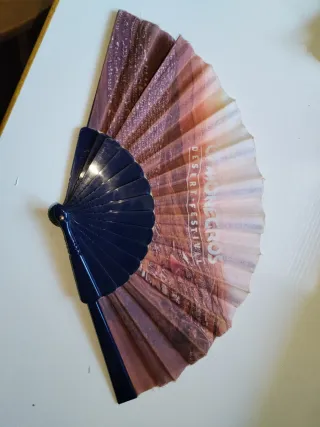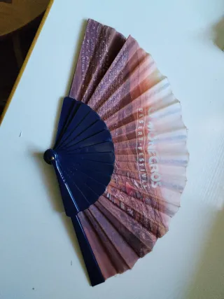 Abanico del festival Monegros del año 2022. Con un diseño colorido y llamativo. - Abanico plegable. - Diseño impreso. - Mango azul.