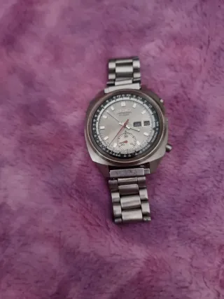 Reloj Seiko 6139 con cronógrafo automático. Un clásico de la relojería. - Esfera plateada. - Correa de acero inoxidable. - Indicador de día y fecha.