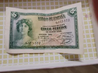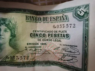 Billete de Certificado de Plata del Banco de España. - Emisión de 1935. - Valor: Cinco Pesetas. - Serie: 6,037,572. - Impreso por Bradbury, Wilkinson & Co L.P. Inglaterra.
