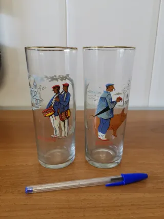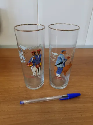 Set de dos vasos de cristal con pinturas decorativas. - Diseño con figuras y escenas. - Borde superior con detalle dorado.