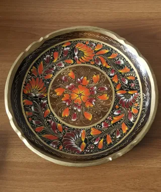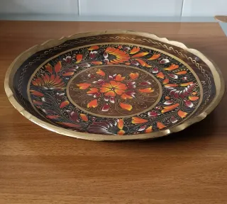 Plato decorativo de madera con un diseño artesanal. Tamaño 35x4 cms. - Pintura floral detallada en tonos cálidos. - Borde con acabado dorado. - Diseño circular con motivos florales.