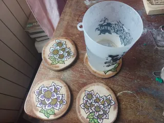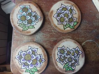 Set de cuatro posavasos de madera, cada uno con un diseño floral único. - Técnica mixta de pirograbado y pintura. - Motivos de flores y hojas. - Base de madera natural.