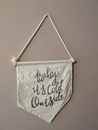 Banderín decorativo con la frase Baby it's cold Outside en letras brillantes. - Diseño colgante con cuerda. - Tela de color menta pálido. - Ideal para decoración temática.