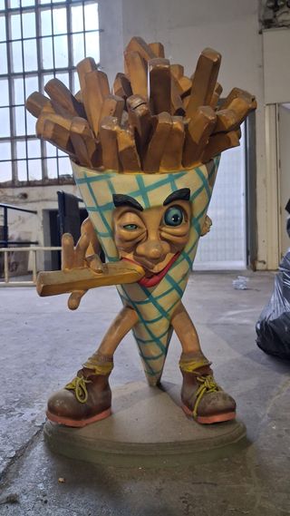 Original escultura decorativa con forma de cono de patatas fritas. Utilizado como decoracion de tienda de patatas fritas en el Casco Viejo de Bilbao. - Diseño divertido y llamativo. - Ideal para coleccionistas o decoración temática. - Le falta el brazo izquierdo. No se lo que puede llegar a costar en estas condiciones, pero lo he visto por 1500€ nuevo. Si te interesa, y la oferta es razonable, llegaremos a un acuerdo.
