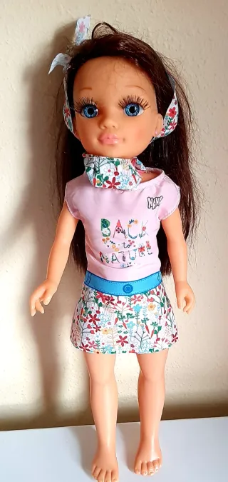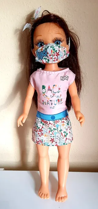 Muñeca Nancy con un conjunto de moda que incluye mascarilla. - Camiseta rosa con estampado Back to Nature. - Falda estampada con flores. - Cinturón azul. - Mascarilla con estampado floral y nombre Nancy. NUNCA SE HA USADO NO TIENE LOS ZAPATOS