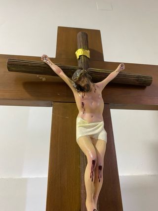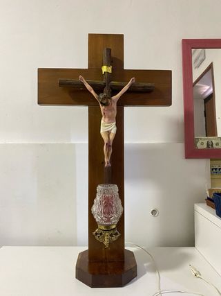 Precioso crucifijo de madera de 88 cm de altura. Es una pieza elegante y detallada. - Material: Madera. - Altura: 88 cm. - Incluye peana con portalámpara.