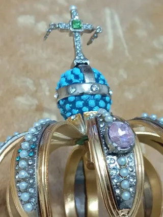 Corona decorativa para la Virgen de Fátima. Para tamaño de 80 cm a 1 m. Copia de la denominada corona rica de la virgen de fátima. - Diseño elaborado y detallado. - Adornada con perlas y piedras. - Color dorado y turquesa.
