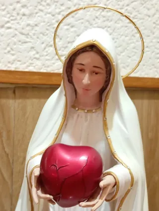 Figura religiosa del Corazón Orante de Fátima. Una pieza con un diseño delicado y espiritual. - Altura de 30 cm. - Representación del Corazón Inmaculado de María.