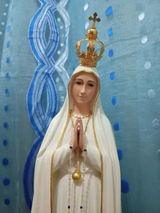 Figura de la Virgen de Fátima de 90 cm de altura. Una pieza religiosa detallada y elegante. Se realizan sobre pedido. - Altura: 90 cm. - Diseño clásico de la Virgen de Fátima. - Corona dorada. - Manto con detalles ornamentales.