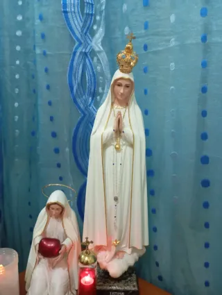Figura de madera de la Virgen de Fátima, ideal para devoción o decoración. - Talla artesanal en madera. - Detallada representación de la Virgen. - Base incluida.