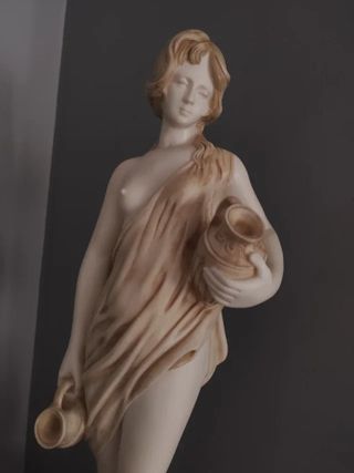 Representa a Hebe, diosa griega de la juventud y copera de los dioses. Es una escultura decorativa de inspiración clásica, con un pedestal de mármol auténtico. Estatua:77 cm Columna: 82 cm