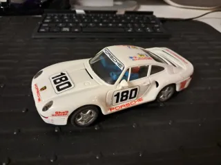 Coche de slot Scalextric Porsche 959 en color blanco. - Réplica detallada del icónico Porsche 959. - Diseño deportivo con dorsal 180. - Detalles de patrocinadores como Porsche y Shell.