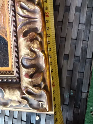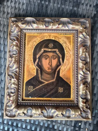 Hermoso icono de la Virgen María en estilo bizantino/ortodoxo (Theotokos), reproducción moderna pero con gran encanto vintage. Pintura sobre tabla con fondo dorado, halo con estrellas (símbolo de virginidad perpetua), expresión serena y hierática. Marco de madera tallada y dorada con motivos vegetales barrocos, muy elegante y bien conservado (pátina natural del tiempo). Medidas: 35 x30 cm (ideal para altar, pared o regalo religioso). Buen estado general, perfecto para devotos, coleccionistas de arte sacro o decoración oriental/católica. #IconoBizantino #VirgenMaria #Theotokos #ArteReligioso #IconoOrtodoxo #MarcoDoradotallado #Virgen