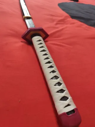 Katana decorativa de la serie "Guardianes de la noche* / "Demon slayer" con empuñadura envuelta en tela blanca y detalles en color burdeos. - Hoja de madera. - Funda de plástico de calidad