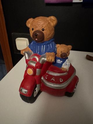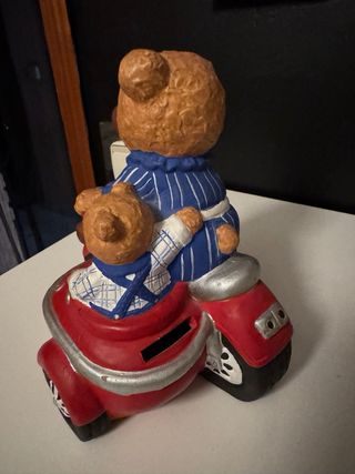Adorable hucha infantil de cerámica con dos ositos montados en una moto. - Diseño divertido y colorido. - Ideal para fomentar el ahorro en los más pequeños. - Fabricada en cerámica.
