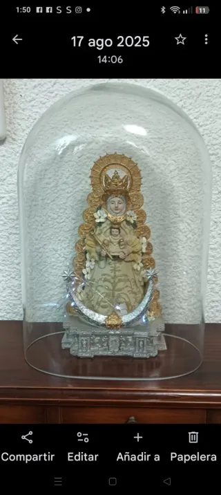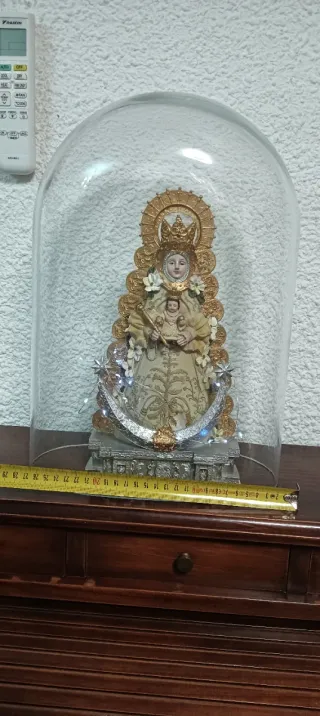Figura de la Virgen del Rocío protegida por una cúpula de cristal. - Base ornamental con detalles plateados y dorados. - Figura detallada de la Virgen con el Niño. - Corona y aureola doradas. - Elementos decorativos como estrellas y flores.