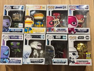 Se venden todos los funko pops de las fotos, en algunos de ellos su caja está un poco desgastada debido a estar mucho tiempo a la luz del sol, sin embargo, la figuras están en perfectas condiciones Ademas, la figura edición especial del stormtrooper, tiene una pequeña raja en el plástico de la caja Cada uno de ellos se vende por un precio de 10€ salvo Saw Guerrera de Star Wars, Rocket de Guardianes de la galaxia y Thanos de marvel (todos por 13€ cada uno) Si se quieren más fotos de alguno en específico, se envía por chat