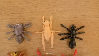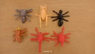 Conjunto de figuras de insectos de plástico. - Incluye araña gris, saltamontes beige, hormiga negra, escorpión naranja y dos escorpiones rojos. - Ideal para coleccionistas o como material educativo.