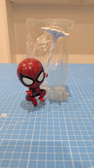 Figura coleccionable de Spiderman con cabeza móvil. - Diseño chibi con detalles del traje clásico. - Base de plástico transparente. - Incluye accesorio de telaraña.
