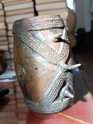 Escultura de cabeza de arte africano, elaborada en bronce. Presenta un diseño detallado y una pátina que refleja su antigüedad. - Material: Bronce - Estilo: Arte africano - Representación: Cabeza humana con tocado elaborado - Procedente de Benin Nigeria. - Mide 50 cm de alto x 20 cm de ancho x 25 cm de profundo 5.2 kilos . - Pieza con muy buenos detalles y patina .