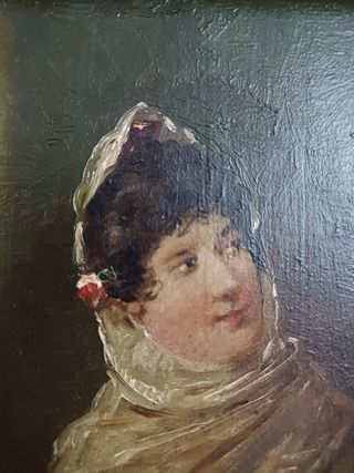 Pintura al óleo sobre tabla, una pieza antigua con firma. Medidas exteriores 25x30 Medidas interiores 8,5x14 - Obra de arte original.