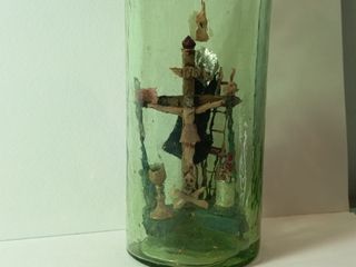Rara botella marinera antigua (Bouteille de Marinier) con una escena religiosa en su interior representando un calvario y un santo, una pieza de arte popular tradicional muy apreciada por coleccionistas. La botella es de Agua de Vilajuïga, con el nombre en relieve en el vidrio, lo que la convierte en una pieza aún más interesante. Este tipo de botellas eran realizadas por marineros o artesanos, introduciendo pequeñas escenas dentro del vidrio, una técnica artesanal muy curiosa. 📜 Época: Finales del siglo XIX o principios del siglo XX. ✨ Características: • Botella marinera / arte popular • Escena religiosa calvario y santo
