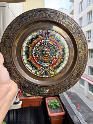 Plato decorativo de bronce con un diseño inspirado en el arte azteca. Ideal para añadir un toque étnico a tu hogar. - Material: Bronce - Diseño: Estilo azteca - Colorido y detallado