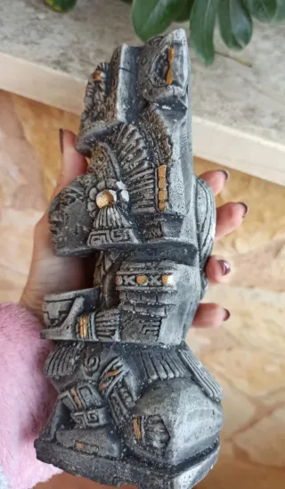Figura decorativa con diseño inspirado en el arte Maya y Azteca. Presenta detalles en dorado y un acabado que evoca la piedra antigua. - Diseño detallado. - Acabado envejecido. Pesa algo mas de 1 kg.