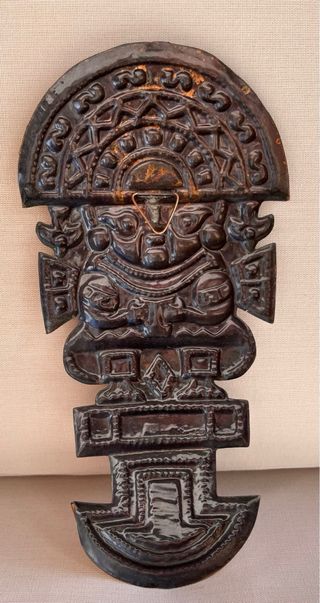 Preciosa máscara antigua con forma de cuchillo “TUMI” Azteca en cobre. El Tumi era un instrumento sagrado utilizado en rituales religiosos, sacrificios y en trepanaciones craneanas (un procedimiento quirúrgico ancestral). El Tumi es un símbolo nacional y un emblema de la herencia cultural del Perú. Esta efigie es un símbolo clave del arte y la religión de las culturas andinas. Medidas 25 cm alto 12 cm ancho Una Pieza increíble hechas a mano con mucho carácter!! Definitivamente debe estar colgado en tu pared!! Muy buscada!!