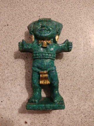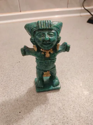 Figura decorativa con un diseño inspirado en el arte azteca. Su acabado verdoso le da un toque antiguo y distintivo echo de grisomola - Diseño detallado. - Acabado en color verde con toques oxidados.