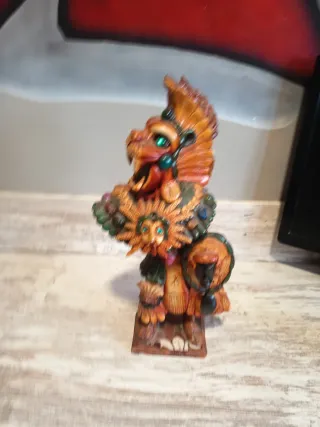 Bonita escultura de madera con un diseño inspirado en el arte Maya o Azteca. La pieza está tallada con gran detalle. - Material: Madera. - Estilo: Maya/Azteca. - Color: Tonos marrones con detalles en verde, rojo y naranja.