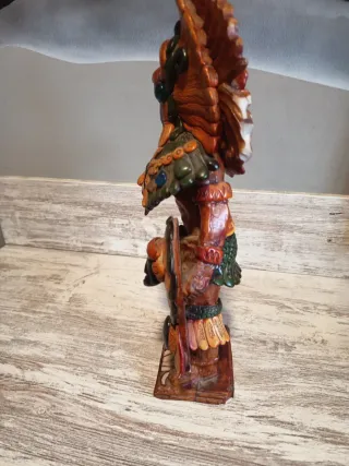 Figura decorativa con un diseño inspirado en el arte azteca. - Detalles en tonos tierra y verdes. - Elaborada con materiales que simulan madera y piedra. - Representación de un guerrero o deidad con tocado y escudo.