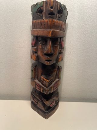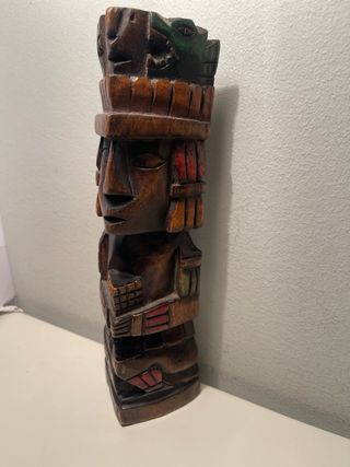 Figura decorativa de madera, tallada a mano con motivos inspirados en la cultura Maya o Azteca. Una pieza única para coleccionistas o amantes del arte. Medidas: 39 cm altura, 14 cm ancho - Material: Madera. - Técnica: Tallado a mano. - Estilo: Inspiración Maya/Azteca.