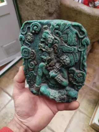 Placa decorativa con diseño azteca, elaborada en malaquita. Arte precolonbino - Representación de figura maya. - Tonos verdes característicos de la malaquita. - Ideal para colgar o exhibir.
