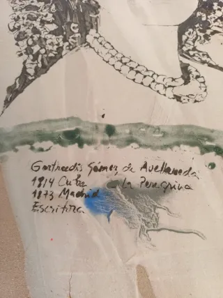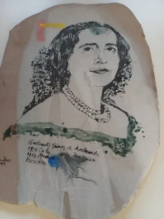 Marca/Autor: Delia Díez. Preciosa y singular pieza de cerámica artesanal, perfecta para coleccionistas, amantes de la literatura y la decoración única. Esta pieza en tono terracota/beige presenta el retrato a Gertrudis Gómez de Avellaneda (1814 - 1873), una de las figuras más importantes de la literatura romántica cubana. Técnica: Dibujo y pintura sobre placa de arcilla/cerámica con acabado esmaltado en algunas áreas. Estilo: Expresivo y rústico, con un toque moderno gracias a los toques de color (amarillo, rojo, verde). Inscripción: Incluye la leyenda "Gertrudis Gómez de Avella y firma de Delia Diaz..
