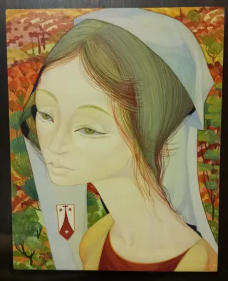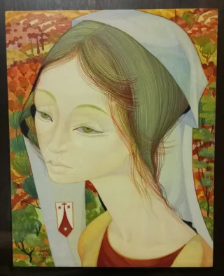 Precioso retrato femenino pintado al temple sobre madera. Autor Jordi Aluma. La obra destaca por su estilo arcaízante ( tipo románico) y la expresividad geométrica del personaje. Obra de principio de la década de los 70 cuando ya esrableció las bases de su estilo y técnica. Alumá recuperó con éxito la técnica medieval del temple sobre madera.Sumando valires del arte moderno como la viveza del color, el fibujo más libre y expresivo y licencias de figuración y temática. Tamalo de la tabla: 34 cm de alto x 28 cm de ancho. Con el marco (tipo vitrina): 58 de alto x 54 de ancho. 5 cm de grueso y unos 3 Kg de peso. Firmado por el artis