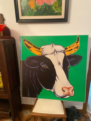 Cuadro original de Antonio de Felipe con su icónica serie de vacas. Una pieza llamativa con un diseño moderno y colorido. - Obra de arte de Antonio de Felipe. - Representación de una vaca. - Fondo verde vibrante.